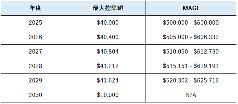 これまで年間$10,000に制限されていた州税・地方税 (SALT) の控除上限額が、2025年度より「$40,000」へ大幅に増額されます。カリフォルニア州やニューヨーク州など、州所得税や固定資産税が高い地域にお住まいの方にとっては、タックスリターンに大きく影響するニュースです。